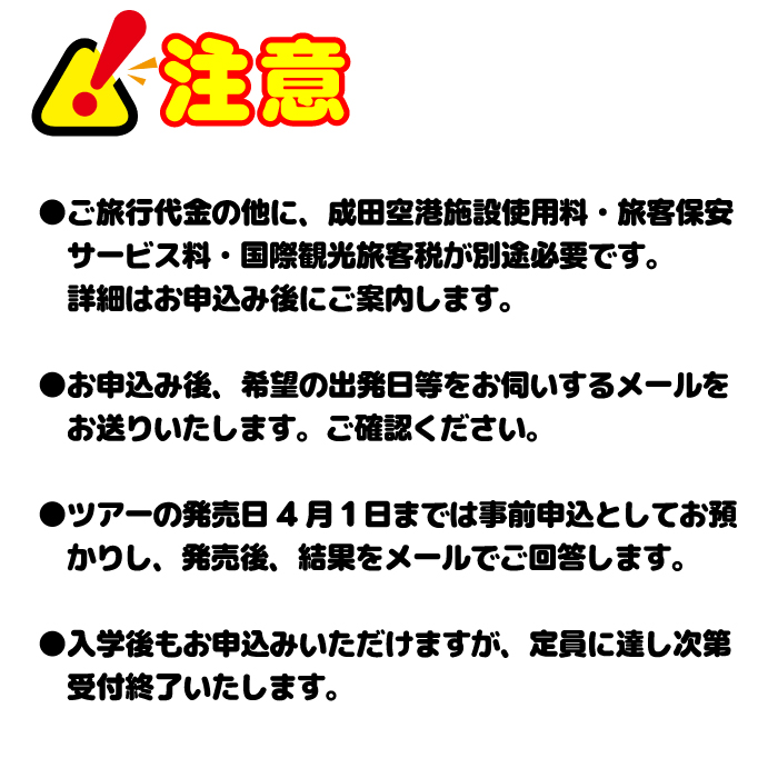 ※別途、日本国内の空港施設使用料(成田2,460円)、旅客保安サービス料(成田700円)および国際観光旅客税(日本出国時1,000円 ※7月頃より3,000円に料金変更予定)が必要となります。お申込みいただいた後、ご案内いたします。