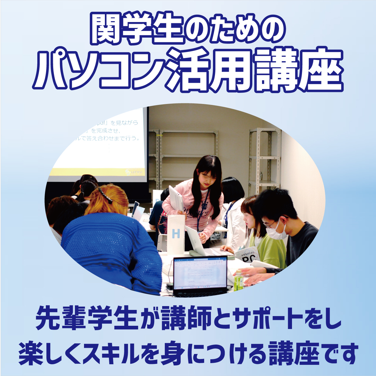 大学生の必須スキルのOfficeの基礎を、関学の先輩学生が講師とTA(ティーチングアシスタント)として運営する楽しく学ぶ講座です。
